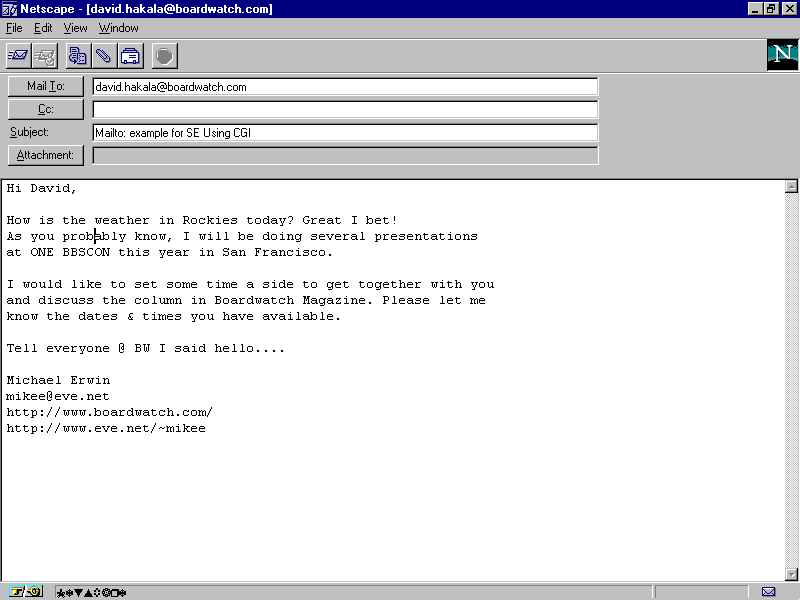 This capability solved the basic problem of needing a CGI script on your server to actually handle the e-mail problem. Most of you have seen this new way of handling mail within the browser. Figure 6.1 shows how the browser renders the URL tag of mailto. The ability to use mailto is a great new solution to the original problem of not being able to handle e-mail in a browser-but it creates only a minimalist mail form.