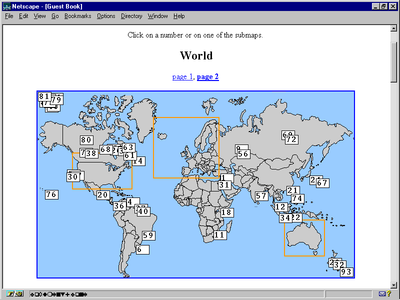 Another popular style of guest book on the Web is highly graphical. This CGI guest book, written by Brigette Jellinek, is comprised of several Perl scripts and is fabulous (see fig. 6.13). This guest book is much more than a visitor's log; it allows the user to click an image map that places a numbered marker at the visitor's geographic location. This number corresponds with the visitor's number in the rest of the log files (see fig. 6.14).