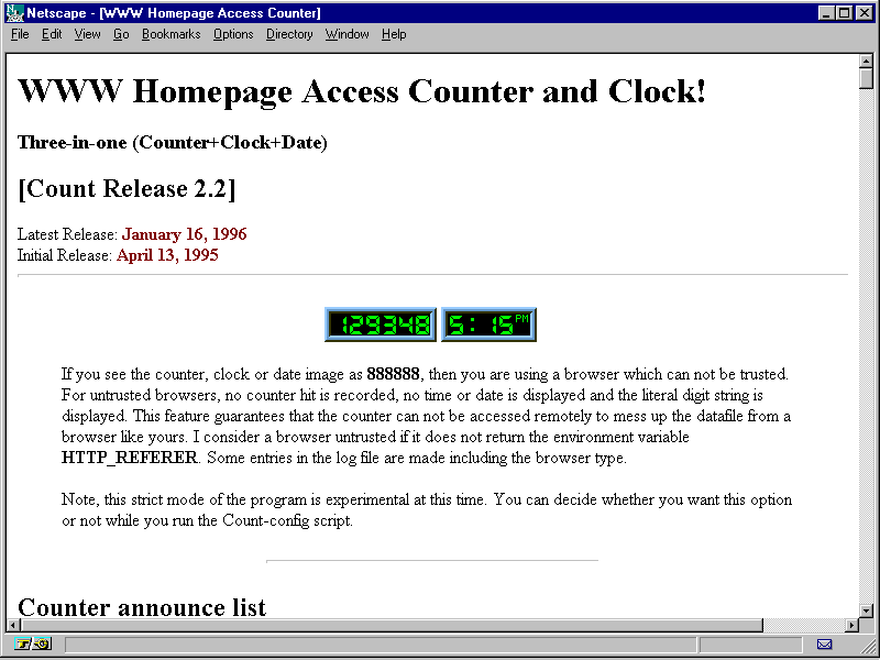 At the time of this writing, the most current version of this counter, version 2.2, is available only for UNIX-based Web servers. An older version, version 1.5, has been ported and made available for OS/2 and Windows NT-based Web servers. And since Muhammad distributes this CGI script as C source code only, and because the counter requires some custom set up, it may be a problem for some to modify the CGI script.