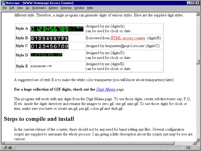 Windows NT-based Webmasters have several choices of CGI page-hit counters to choose from. Behold! Software makes a CGI counter that runs on Windows NT and Win95. The company also has specific CGI scripts for Windows NT running on Intel-, Alpha-, and MIPS-based hardware. (This CGI software is donation-ware; if you like the software and decide to use it, the writers of the software ask that you send them a donation.)