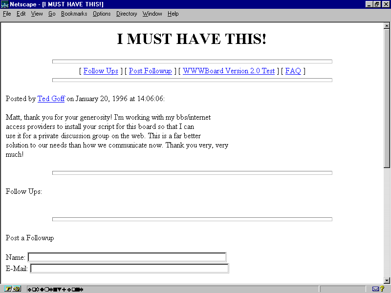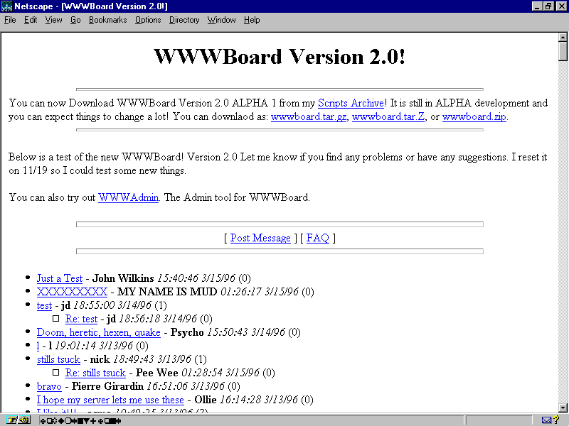 A look at the HTML interface of various WWWBoard-posted messages also shows the replies, names, date, and time of the post.