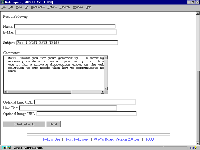 This section of the WWWBoard message follow-up HTML form allows replies to be posted.