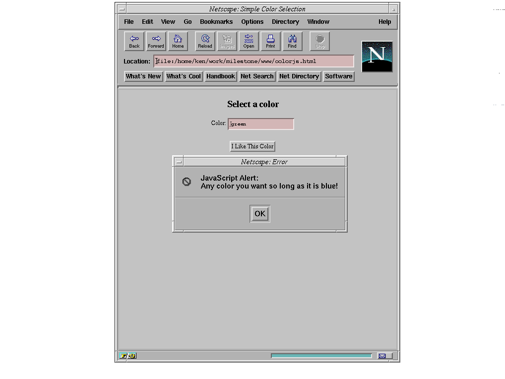 alert("Any color you want so long as it is blue!");