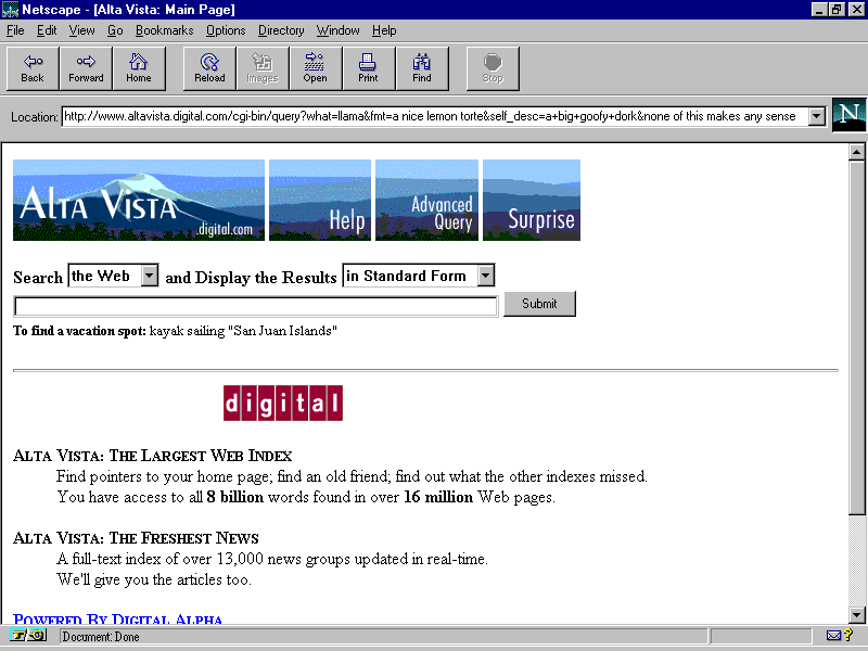 For example, when you click the Submit button on a form, Netscape will put a long string in its Location field that's made up of the CGI's URL followed by a string of data, most of which will look like the NAMEs and VALUEs defined in the form. If you want, you can freely edit the contents of the Location field and change the data to whatever you want: add fields that the form didn't have; extend text data limited by the MAXLENGTH option; or almost anything. Figure 27.1 shows the URL that a CGI script expects submitted from a form.