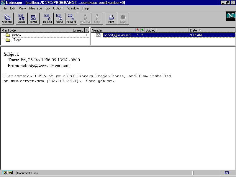 A Trojan horse CGI script can go so far as to deliver mail to its author, letting him know that it's waiting.
