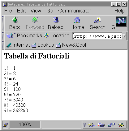 Un esempio di procedura Javascript e' la seguente, che produce una piccola tabella di fattoriali: