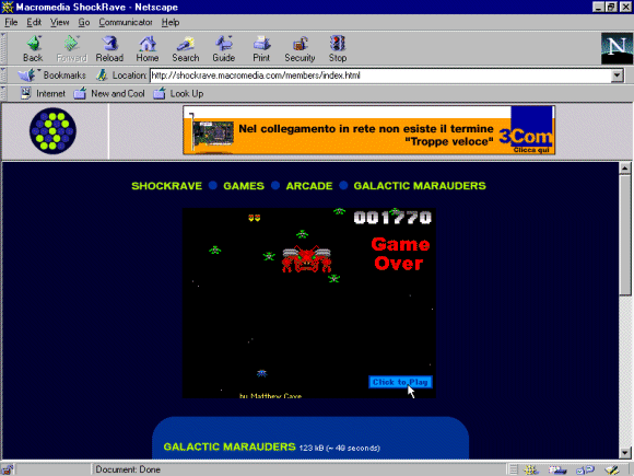 Un plug-in a pieno schermo invece assume totalmente il controllo della finestra del browser, aggiungendo eventualmente pulsanti e barre di controllo. Un plug-in nascosto, infine, svolge la sua funzione in background. Plug-in di questo tipo sono utilizzati ad esempio per riprodurre file audio, o suoni dal vivo in modo sincrono. L'elenco dei plug-in disponibili è molto lungo [14]: ci sono visualizzatori per i vari formati video (MPEG e Quicktime), audio (MIDI, Wav), di grafica vettoriale (CGM, Corel Draw, AutoCAD); ci sono plug-in che permettono di visualizzare applicazioni multimediali e interattive prodotte con software come Macromedia Director (ne parleremo tra breve), Adobe Page Maker, Asymetrix Toolbook; ci sono infine dei plug-in che permettono di integrare all'interno delle pagine Web intere applicazioni come fogli di calcolo, o di sfruttare le tecnologie di interazione tra applicazioni come il famoso Object linking and Embedding (OLE) di Windows. In questa sede, per ovvi motivi di spazio, è impossibile vedere le funzionalità e le caratteristiche specifiche di ognuno. Abbiamo dunque scelto di illustrarne solo alcuni fra i più diffusi e importanti. In linea generale la loro utilizzazione è piuttosto immediata, specie per i visualizzatori di file multimediali. Ricordiamo comunque che tutti i plug-in sono distribuiti con un adeguato corredo di documentazione, alla quale ricorrere per eventuali approfondimenti. I Plug-in MacromediaShockwave è una tecnologia sviluppata dalla Macromedia (http://www.macromedia.com), e permette di visualizzare animazioni e applicazioni multimediali realizzate con Director. Director è un programma nato originariamente per fare animazioni su piattaforma Macintosh; portato successivamente anche in ambiente Windows, è stato sviluppato fino a divenire uno dei più potenti e diffusi software di authoring multimediale. Oltre ad avere pregevoli funzioni di animazione digitale, è dotato di un linguaggio di programmazione object-oriented, dal suggestivo nome Lingo, e può essere usato per costruire complesse applicazioni interattive. I requisiti tecnici, e il fatto di essere nativamente disponibile su entrambe le piattaforme dominanti nel personal computing, ne hanno fatto uno degli standard nel mercato multimediale su CD-ROM. Il plug-in Shockwave è in grado di interpretare anche tutti i formati delle altre applicazioni grafiche e multimediali della Macromedia, e può ricevere suono in tempo reale da Internet. Oltre all'originario Shockwave (che comunque continua ad essere incessantemente migliorato), la Macromedia ha sviluppato numerosi altri prodotti e plug-in destinati alla rete. Flash, per esempio, permette di attivare applicazioni multimediali e interattive in modalità streaming. RealFlash, sviluppato insieme alla casa produttrice di RealPlayer, unisce l'interazione tipica di Director agli avanzati algoritmi di compressione dati streaming prodotti dalla RealNetworks. Da una sapiente mistura di Shockwave, Flash, RealPlayer, JavaScript, nasce l'iniziativa ShockRave, che raccoglie una serie di applicazioni multimediali/interattive particolarmente avanzate: dalle pagine di ShockRave (http://shockrave.macromedia.com) si potrà ascoltare musica dal vivo, vedere filmati e persino giocare, utilizzando tranquillamente una finestra del nostro comune browser, con un videogame. Il plug-in necessario alla visualizzazione delle animazioni Flash è incluso nel CD-ROM allegato a questo manuale, e viene utilizzato per visualizzare alcune delle animazioni che vi abbiamo inserito (programma e filmati su CD)