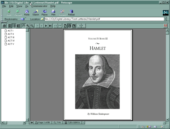 Per realizzare questo tipo di immagini bisogna prima scattare una serie di foto lungo l'arco di visuale che si vuole riprodurre, curando di sovrapporre ogni inquadratura di circa il 50%. Le immagini vanno poi digitalizzate (oppure vanno riprese con camere digitali), e date in pasto al sistema autore QTVR, che le fonde in un continuum unico. Attualmente Quicktime è giunto alla sua quarta versione, scaricabile dal sito Web http://www.quicktime.apple.com. È disponibile in versione Macintosh, Windows 3.x, e Windows 95/98/NT. Tutte le versioni possono essere usate sia con Netscape sia con Explorer. Tra le novità introdotte dall'ultima versione troviamo la capacità di riprodurre file in streaming video; si tratta di una tecnologia sulla quale ci soffermeremo tra breve. Ricordate che i panorami virtuali e i video QuickTime, come del resto ogni tipo di formato video digitale, quando non utilizzano la tecnologia streaming producono dei file di dimensioni ragguardevoli anche se durano pochi secondi (dell'ordine delle centinaia di KByte, come minimo). Dunque prima di scaricarne uno con una semplice connessione via modem, preparatevi a lunghe attese. E i risultati non sempre valgono la pena... e la spesa! Adobe Acrobat ReaderAcrobat è un sistema sviluppato dalla Adobe, la maggiore azienda nel settore del desktop publishing, e permette di distribuire documenti elettronici impaginati e formattati. Si basa su un particolare formato di file, il Portable Document Format, simile al linguaggio PostScript usato dalle stampanti professionali. A differenza di altri formati, un documento PDF mantiene inalterata la sua impostazione grafica originale in ogni condizione di visualizzazione. Per visualizzare un file PDF è necessario utilizzare un apposito programma di lettura, Acrobat Reader, disponibile per molte piattaforme (Macintosh, Windows, e vari Unix). Mentre il sistema di creazione dei file è un software commerciale, Acrobat Reader può essere distribuito gratuitamente: la Adobe lo mette a disposizione all'indirizzo http://www.adobe.com/acrobat, e potete trovarne l'ultima versione anche sul CD-ROM allegato a questo libro (programma su CD). La versione più recente rilasciata dalla Adobe è la 4, che può funzionare sia come browser stand alone sia come plug-in per Netscape ed Explorer. In questo modo i file PDF possono essere distribuiti su Internet. L'installazione è completamente automatizzata, e rileva automaticamente la presenza del browser Web (o di entrambi, se presenti sul disco), collocando i moduli plug-in nelle apposite directory. Una volta installato, Acrobat Reader viene avviato ogni volta che da una pagina Web si attiva un link che punta ad un file PDF. Normalmente il plug-in Acrobat funziona in modalità pieno schermo. Un documento PDF può anche essere inserito all'interno di una pagina Web, ma in questo caso i comandi di navigazione sono visibili solo con Microsoft Internet Explorer. Nella figura 56 potete vedere una edizione elettronica dell'Amleto di Shakespeare all'interno di Netscape. La finestra del browser viene arricchita da una serie di pulsanti che permettono di navigare nel documento, e di modificarne le condizioni di visualizzazione e di ingrandimento. La parte sinistra della finestra può contenere un indice attivo dei contenuti o un elenco delle pagine. È inoltre possibile selezionare e copiare testo e grafica.