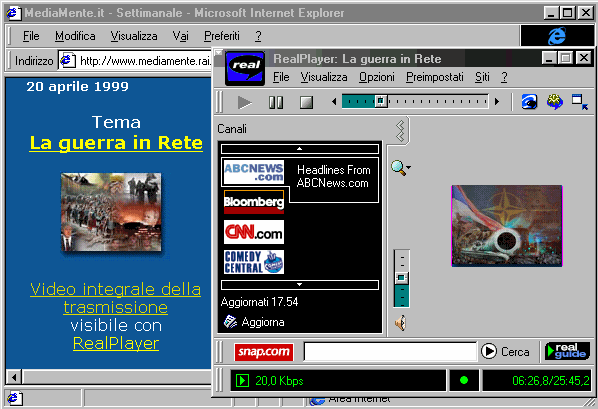 I file PDF sono in grado di includere informazioni multimediali, come immagini, suoni, animazioni e anche filmati. Nelle ultime versioni è inoltre possibile inserire link ipertestuali che collegano elementi interni al documento, o che rinviano ad altre pagine o risorse su Web. La dimensione di un documento PDF, a parità di contenuto, è molto superiore a quella di una semplice pagina HTML. Per ottimizzare l'accesso ai file PDF su Internet, alcuni server HTTP possono inviare solo le pagine richieste esplicitamente dall'utente. In caso contrario, prima di visualizzare il documento, il plug-in deve attendere che l'intero file venga trasferito. Audio e video in tempo realeUna tecnologia che ha conosciuto negli ultimi anni un'enorme espansione è rappresentata dalla diffusione, attraverso World Wide Web, di contenuti multimediali (e in particolare audio e video) in tempo reale. Sappiamo già che le pagine Web possono ospitare al loro interno informazione di tipo diverso: immagini, suoni, animazioni, grafica vettoriale, filmati. In condizioni normali, per visualizzare queste informazioni il nostro programma di navigazione è obbligato ad attendere che la ricezione del file che le contiene sia terminata. Ma sappiamo bene che alcuni tipi di informazione, soprattutto sonora e visiva, tendono ad essere molto esosi in fatto di spazio. Di conseguenza, l'utente che non ha la fortuna di possedere un collegamento Internet ad alta velocità sarebbe costretto ad attendere diverse decine di minuti per vedere pochi secondi di immagini in movimento, in una piccola finestra del suo schermo... magari per accorgersi che non ne valeva proprio la pena. Inoltre, le tecniche tradizionali di trasferimento - che richiedono lo scaricamento completo di un file prima di poterne utilizzare il contenuto - impediscono la trasmissione e la ricezione 'in diretta' di audio e video, impediscono insomma l'Internet broadcasting. Per ovviare a queste limitazioni è stata sviluppata una classe di tecnologie che viene collettivamente indicata con il termine di data streaming, flusso di dati; in particolare ci interessano qui le tecnologie di streaming audio e video. Si tratta di un sistema che permette di inviare filmati o suoni digitali sotto forma di un flusso continuo di dati, che un programma client è in grado di interpretare in tempo reale, man mano che i dati stessi vengono ricevuti. In questo modo la riproduzione può iniziare immediatamente, mentre la ricezione della parte restante dell'informazione avviene simultaneamente, in background. Lo streaming, dunque, rende possibile applicazioni come la telefonia, la radiofonia e la televisione via Internet, senza richiedere alcuna infrastruttura straordinaria. Infatti, per conseguire una riproduzione abbastanza fluida è sufficiente disporre di una banda passante sufficientemente ampia e costante: per uno streaming audio di discreta qualità, e per uno streaming video non certo ottimale ma comunque utilizzabile, i requisiti di larghezza di banda sono in genere alla portata degli attuali modem (anche se non sempre questo si può dire dei grandi canali di connessione della rete, che soffrono quasi endemicamente di congestione e sovraffollamento). Dal punto di vista qualitativo, la trasmissione via rete di informazioni sonore ha raggiunto ormai livelli simili, e in qualche caso superiori, a quella via etere. Diverso, naturalmente, il discorso per il video: per il momento, ci si deve accontentare di immagini racchiuse in piccole finestre, certo non spettacolari, accompagnate da un audio di mediocre qualità, talvolta fuori sincrono. Si tenga conto, tuttavia, che si tratta di una tecnologia ancora giovane, il cui sviluppo sta avvenendo a tappe accelerate. Per avvalersi dello streaming audio e video, ovviamente, è necessario far uso di software dedicati. Infatti i file utilizzati in queste applicazioni sono codificati in formati speciali, ottimizzati e compressi per aumentare l'efficienza e la stabilità del flusso di dati. Le soluzioni proposte in quest'ambito sono diverse, e poiché si tratta di un settore in continua evoluzione, è assai difficile dire con certezza quale si affermerà come standard. Per quanto riguarda i programmi client, l'aspetto che maggiormente ci interessa in questa sede, possiamo dire che molti di essi hanno la duplice forma di programmi autonomi, e di plug-in capaci di integrarsi nella finestra del browser. Nei prossimi paragrafi ci occuperemo in particolare dei sistemi di streaming unidirezionale - quelli, cioè, che permettono l'Internet broadcasting e attraverso i quali all'utente è riservato il solo ruolo di destinatario di informazione -, che possono essere considerati una estensione di World Wide Web. Abbiamo dedicato invece un capitolo a parte alle applicazioni di telefonia e videotelefonia su Internet. RealPlayerNel settore dello streaming audio il protagonista indiscusso è stato negli ultimi anni RealPlayer, sviluppato dalla RealNetworks. Si tratta di un'applicazione che permette la ricezione in tempo reale di file sonori e audio/video tramite Internet, rendendo possibile la creazione di vere e proprie stazioni radio e televisive digitali in rete. La qualità del suono digitale in formato RealPlayer è funzione della velocità di connessione: ottima se si dispone di una connessione veloce (come ISDN, o superiore), comunque buona anche con un normale modem. Naturalmente la qualità effettiva della riproduzione dipende anche dalla scheda sonora installata sul computer e dai diffusori ad essa collegati, nonché dalla situazione del traffico di rete, che spesso impedisce di sfruttare appieno la velocità del modem. RealPlayer è disponibile su Web all'indirizzo http://www.real.com, per piattaforme Windows, Macintosh e Unix. Il programma esiste in due versioni: quella gratuita, dalle funzionalità più limitate ma comunque perfettamente in grado di ricevere streaming sia audio sia video e adatta alla maggior parte delle situazioni, e la versione Pl
