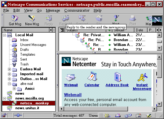 Discussions of 3 dimensional imaging. Le gerarchieCome avrete notato, il nome di un newsgroup è composto da più 'pezzi' separati l'uno dall'altro da un punto. La prima sezione del nome è la più generale, e indica la categoria alla quale appartiene il gruppo; la seconda è un po' più specifica, e individua una sottocategoria; questo meccanismo prosegue fino all'ultima sezione del nome. In tal modo, con un meccanismo gerarchico assai simile a quello utilizzato per l'attribuzione dei nomi ai nodi della rete (ne parleremo in seguito), è possibile individuare a colpo d'occhio la 'classificazione' del newsgroup. Ad esempio, il newsgroup rec.arts.movies è un newsgroup che appartiene alla categoria 'Recreational' (riguarda cioè attività ricreative), sottocategoria 'Arts', settore 'Movies' (film). Ma quali sono le categorie principali? La stringa iniziale 'alt.' identifica i newsgroup appartenenti alla gerarchia 'alternative' che si occupa programmaticamente di 'modi alternativi di guardare al mondo'. Si tratta a volte di gruppi alquanto bizzarri, che includono ad esempio arene per i fan di moltissimi personaggi del mondo dello spettacolo, della religione o della politica, per gli appassionati degli hobby più strani, per varie forme di espressione artistica e no. Fra le altre gerarchie, ricordiamo: 'comp.' per l'informatica e i computer, 'news.' per le notizie d'attualità (di tutti i tipi, ma in particolare quelle riguardanti la rete), 'rec.' per le attività ricreative, 'sci.' per il mondo della scienza, 'soc.' per la discussione di problemi sociali; 'talk.' per ogni tipo di dibattito, su argomenti che spaziano dall'ambiente alla religione; 'misc.' (un po' di tutto), 'bit.' per i gruppi BitNet (una sottorete di Internet i cui newsgroup si segnalano per il fatto di archiviare anche un certo numero di liste postali), 'de.' per i gruppi (in genere in tedesco) che riguardano la Germania, e così via. La gerarchia 'it.', che riguarda l'Italia e comprende gruppi in italiano, è una delle ultime nate, ma è cresciuta in fretta. Nel marzo 1996, quando scrivevamo la prima versione di questo volume, ne esistevano una quarantina, e potevamo inserirne in queste pagine l'elenco completo. Già nel febbraio 1997 questo numero si era più che quadruplicato, e in Internet '97 citavamo la già ragguardevole cifra di circa 170 newsgroup; nel corso degli anni successivi la crescita è continuata, e nell'agosto 1999 i newsgroup italiani erano ormai più di 400. Siamo quindi costretti a rimandarvi, per consultarne l'elenco completo, alle relative FAQ (Frequently Asked Questions); si tratta di un documento ricco di utili informazioni e raggiungibile (assieme a diversi altri che riguardano il mondo dei newsgroup italiani) attraverso la URL del gruppo di coordinamento News-it: http://www.cilea.it/news-it/Index.html. Alternativamente, potete provare all'indirizzo http://www.poli.studenti.to.it/news-it/FAQ.html. Se volete un po' di statistiche sui newsgroup italiani date un'occhiata all'indirizzo http://serra.unipi.it/usenet/stats/flowstat/it/ (scoprirete così ad esempio che nel giugno 1999 sono comparsi nei soli newsgroup italiani un totale di 499.529 messaggi diversi, equivalenti a ben 1.582.221.020 bytes!) Tenete anche presente che alla URL http://bertola.eu.org/usenet/faq/main.htm troverete i link a un gran numero di FAQ e documenti informativi e di aiuto in italiano, dedicati un po' a tutti gli aspetti di Internet, e con un'ampia sezione relativa ai newsgroup del nostro paese. Infine, una risorsa davvero preziosa: il servizio Mailgate, all'indirizzo http://www.pantheon.it/mailgate o http://www.mailgate.org, permette di consultare i newsgroup italiani via Web. Alcune conferenze che è bene conoscereAbbiamo già accennato a news.lists, il newsgroup che fornisce informazioni sulle nuove liste che appaiono quasi quotidianamente su Internet. Altri newsgroup che possono essere utili sono news.announce.important, che fornisce notizie di interesse generale sulla rete (e non solo); news.announce.newsgroups, che fornisce informazioni sui nuovi newsgroup; news.announce.newusers, particolarmente dedicato ai navigatori Internet alle prime armi e complementare a news.newusers.question, dove i 'newbie' (in gergo, i 'principianti' di Internet) possono trovare le risposte a molte loro domande - e fare quelle alle quali non hanno trovato risposta. Una sede più informale per gli stessi argomenti è data dai newsgroup alt.newbie e alt.newbies. Discussioni generali sui gruppi Usenet trovano posto anche in news.misc. Altri newsgroup che possono offrire aiuti sono rec.answers e alt.internet.services. E non scordate la conferenza internazionale 'ufficiale' sull'Italia: soc.culture.italian. Per quanto riguarda la gerarchia it., vanno ricordate almeno le conferenze it.news.gruppi, con la discussione su tutto quanto riguarda i newsgroup italiani, e it.comp.aiuto, prezioso per chi avesse problemi informatici di qualunque tipo. Infine, se trovate che nella gerarchia it. manchi un gruppo che considerate essenziale, e volete promuoverne la creazione, ricordate che alla già citata URL http://www.cilea.it/news-it/ troverete moltissimo materiale sui newsgroup italiani e dettagliate istruzioni su come e dove presentare la vostra proposta. I programmi per accedere ai newsgroupVeniamo adesso ai programmi da utilizzare per accedere alle 'sale conferenze', ovvero per consultare i newsgroup presenti su Internet ed eventualmente per inviarvi i nostri messaggi. In inglese si chiamano 'newsreader'. Prima di considerare i principali programmi che rientrano in questa categoria, un consiglio generale: esiste un apposito newsgroup nel quale compaiono periodicamente informazioni e documenti sui più comuni newsreader. Si chiama news.software.readers, e vi potrete trovare risposte a molte delle vostre domande in materia. Anche nel caso dei newsreader, come già per i programmi di gestione della posta elettronica, possiamo soffermarci solo su alcuni de
