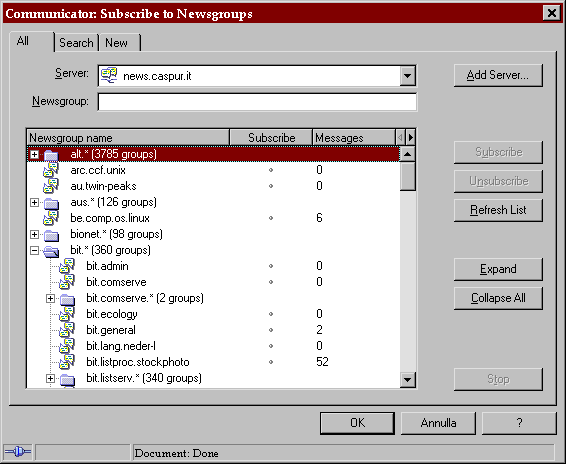 Fatto questo, per partire all'esplorazione dell'universo dei newsgroup vi basterà scegliere il news server preferito e, al suo interno, il newsgroup da consultare. Per visualizzare i newsgroup disponibili su un determinato news server basta un click col tasto destro del mouse sul nome del news server, scegliendo quindi l'opzione 'Subscribe to Newsgroup'. La prima volta, prima di visualizzare l'elenco dei newsgroup disponibili occorrerà aspettare qualche secondo (e a volte qualche minuto), mentre Messenger lo scarica dal news server: in questo caso, la scritta 'Receiving Newsgroups' sulla barra di stato del programma vi informa sull'operazione in corso.
