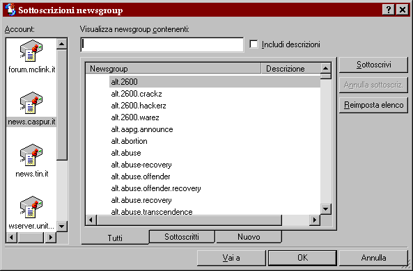 Come fare a scegliere i newsgroup da seguire? Sempre dalla schermata principale di Outlook Express, basterà selezionare la voce 'Newsgroup' del menu 'Strumenti': vi verrà proposto un elenco dei newsgroup accessibili (tutti, solo quelli ai quali si è abbonati, o solo quelli aggiunti dal news server con l'ultimo aggiornamento dell'elenco). È anche possibile ricercare, all'interno dell'elenco dei newsgroup, quelli il cui nome contiene una determinata stringa di testo. I pulsanti 'Sottoscrivi' e 'Annulla sottoscrizione' permettono di selezionare i gruppi che ci interessa seguire: i newsgroup in tal modo prescelti saranno direttamente accessibili dalla finestra principale del programma. Il pulsante 'Vai a' infine, ci permette l'accesso diretto al singolo newsgroup selezionato.