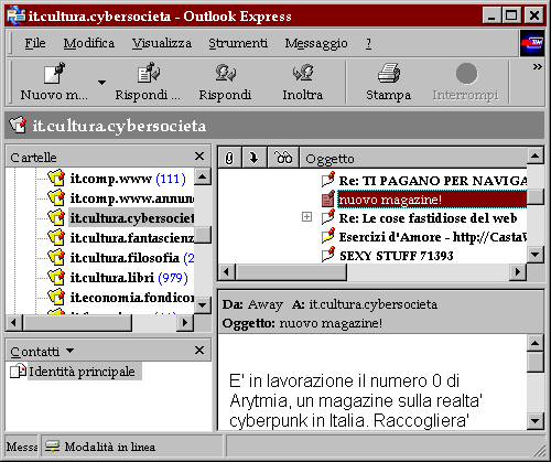Le conferenze in rete (newsgroup)Dopo aver esaminato alcuni fra i molti volti di World Wide Web, la funzionalità di Internet sicuramente più popolare, e i principali strumenti disponibili in quest'ambito, rivolgiamo ora la nostra attenzione a un aspetto della rete per certi versi meno spettacolare, ma non meno interessante: il mondo delle conferenze, o newsgroup. Parlando della posta elettronica avevamo già considerato uno strumento di interazione 'di gruppo' attraverso la rete: le liste di distribuzione postale. Ma nell'universo delle comunicazioni telematiche ci sono altri sistemi, oltre alle liste postali, per creare un 'forum' di discussione elettronica fra persone che condividano comuni interessi o curiosità. Uno dei principali è rappresentato proprio dalle cosiddette 'conferenze' o newsgroup: aree di discussione pubblica che ricordano, come meccanismo di funzionamento, le bacheche di una università o - per chi ha un passato di impegno politico - i tazebao degli anni della contestazione. Vediamo un po' più da vicino di cosa si tratta. L'idea di base è semplice, ed è stata sperimentata per anni dai sistemi telematici amatoriali, le cosiddette BBS (Bulletin Board System): offrire a tutti gli interessati uno spazio - in genere dedicato a un tema specifico - in cui scrivere messaggi. A differenza dei messaggi postali, quelli inviati a una conferenza non hanno un vero e proprio destinatario: sono semplicemente 'affissi' su una bacheca virtuale. Chi passa di lì, ed è interessato all'argomento, può leggerli, commentarli, rispondere. Naturalmente il tutto avviene in maniera elettronica: per consultare una bacheca dobbiamo conoscere il suo nome e fornirlo a un programma capace di 'muoversi' per noi, andando a recuperare, in rete, la lista dei messaggi che vi sono contenuti. A partire da questa lista potremo poi leggere i singoli messaggi che ci interessano. E naturalmente potremo in ogni momento inserirne di nostri. Le conferenze localiGli antenati delle conferenze in rete (o newsgroup) sono, come si è accennato, le conferenze locali offerte da molti sistemi amatoriali. Dato che diversi sistemi amatoriali sono diventati col tempo veri e propri fornitori di connettività Internet (fra gli esempi più noti ricordiamo MC-link, Agorà, Galactica), e che anche molti fra i fornitori di connettività sviluppatisi negli ultimi anni hanno pensato bene di offrire ai propri utenti - o all'intera comunità di rete - un certo numero di aree di conferenza, moltissimi utenti della rete - tutti quelli cioè che si collegano attraverso uno di questi fornitori - hanno a disposizione, magari senza saperlo, anche un certo numero di conferenze locali. Anche molte università hanno realizzato, negli ultimi anni, un sistema di conferenze che riguarda la vita interna dell'ateneo, e ne affianca il sito Web. Spesso queste conferenze sono organizzate come veri e propri newsgroup Internet, che però talvolta non sono accessibili dall'esterno, e restano dunque un 'valore aggiunto' fornito ai soli abbonati al particolare sistema che le ospita. In altri casi, il meccanismo scelto è invece quello delle 'conferenze via Web': la consultazione dell'elenco dei messaggi avviene cioè a partire da una pagina Web, che permette anche di inviare nuovi messaggi o di rispondere a quelli già presenti. Sottovalutare il rilievo informativo di queste conferenze locali sarebbe un grave errore: proprio perché in genere raccolti attorno a un singolo sistema, i partecipanti allo scambio informativo hanno infatti una omogeneità di intenti e interessi che i newsgroup su Internet possono raramente vantare. Basti pensare, ad esempio, al fattore linguistico (i messaggi nelle conferenze locali di un sistema telematico italiano sono di norma nella nostra lingua), o a casi come le conferenze tecniche di MC-link (che raccolgono un gran numero di appassionati particolarmente competenti in campo informatico) o quelle politiche di Agorà (nata storicamente nell'ambito dell'area radicale, e che ospita numerose discussioni su tematiche politiche, sociali ed ecologiste). Conferenze di questo tipo conservano inoltre quasi sempre un archivio storico dei messaggi inviati, che si rivela spesso una preziosa fonte di informazioni. Le conferenze locali mettono dunque a disposizione degli utenti una collezione di messaggi suddivisi per argomento, memorizzati su computer e in genere controllati da un moderatore che ha il compito di limitare l'incidenza di eventuali messaggi polemici, inutili o fuori tema. Come nel caso delle liste postali già considerate, o dei newsgroup su Internet che discuteremo tra poco, esistono conferenze locali dedicate agli argomenti più diversi: si va dalla musica alla programmazione, dalla fotografia alla cucina. Ogni messaggio è dotato di una scheda informativa (header), generata automaticamente dal computer, che riporta il nome dell'autore, la data di immissione, la lunghezza del testo e così via. Nel passato, queste conferenze erano spesso gestite dal sistema in maniera indipendente dalle funzionalità offerte per la connessione a Internet, e le modalità di accesso variavano a seconda del sistema telematico cui si era abbonati. Ma l'era delle conferenze locali che sfruttano protocolli o interfacce proprietarie è ormai tramontata. È infatti molto più semplice e conveniente utilizzare tecnologia Internet anche per realizzare sistemi di discussione chiusi o solo parzialmente aperti all'esterno. Questa evoluzione ha portato anche i grossi servizi telematici come Compuserve, Microsoft Network e America On Line a ripensare la propria collocazione e a ridefinirsi, anziché come sistemi chiusi e autonomi, come 'reti nella rete', capaci di sfruttare in tutto e per tutto gli standard Internet di interscambio dell'informazione ma anche di limitare ai soli abbonati l'accesso ad alcune aree o servizi. Anche per questo, una volta sottolineato il ruolo e l'interesse delle conferenze locali, possiamo rimandare tranquillamente,