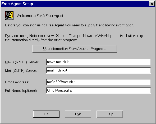 Quanto ai pulsanti, essi permettono, nell'ordine, di scrivere un nuovo messaggio, preparare una risposta da inviare al newsgroup, rispondere direttamente all'autore, far procedere il messaggio verso un nuovo destinatario, stampare il messaggio corrente, sospendere il caricamento dei messaggi. A seguire (non compresi nell'immagine) troviamo poi i familiari pulsanti per la gestione della posta. Se nella finestra di sinistra, anziché essere selezionato il nome di un newsgroup, è selezionato il nome di un news server, l'area di destra ospiterà anche tre larghi pulsanti: 'Sincronizza account', per scaricare dal news server le informazioni relative ai nuovi messaggi presenti nei newsgroup che abbiamo sottoscritto; 'Newsgroup', per arrivare alla finestra - già esaminata - per la consultazione dell'elenco dei newsgroup e la loro eventuale sottoscrizione, e 'Impostazioni', che permette di decidere individualmente le opzioni di sincronizzazione per i singoli newsgroup sottoscritti. AgentAgent è un piccolo capolavoro. Creato dalla Forté, una software house californiana, al suo apparire, ormai cinque anni fa, ha rivoluzionato la fruizione dei newsgroup, all'epoca considerati una risorsa assai scarsamente multimediale. Non è un caso che proprio al modello rappresentato da Agent si siano ispirati tutti i news reader più recenti, fra cui quelli integrati in Netscape e in Internet Explorer dei quali abbiamo appena parlato. Va detto, tuttavia, che Agent rimane ancora un programma dalle notevolissime potenzialità: la sua capacità di costruire automaticamente (e in maniera altamente configurabile) un database dei newsgroup esistenti e di quelli frequentati, dei messaggi letti e di quelli da leggere, e la facilità di gestione degli eventuali file allegati, anche se suddivisi in più messaggi, continua a renderlo uno degli strumenti migliori per la navigazione fra i newsgroup. Inoltre, molte operazioni possono essere effettuate off-line, minimizzando i tempi (e i costi) di connessione a Internet. Nel primo numero di Notizie dalle reti, Giuseppe Salza notava correttamente che "Il ciclo evolutivo del Net è rapidissimo. Nel febbraio 1995, Usenet richiedeva ancora una notevole dose di pazienza e sofferenza per tutti coloro che non volevano pagare bollette telefoniche astronomiche. Nel giro di poche settimane, Agent ha provocato una gigantesca rivoluzione culturale (...) e ha scagliato i primi sassi che conducono all'universalizzazione della norma multimediale MIME" [16]. Agent esiste in due versioni: quella commerciale, che include anche un avanzato gestore di posta elettronica, e una versione totalmente gratuita, Free Agent. Entrambe le versioni possono essere scaricate direttamente via Internet, partendo dalla pagina su World Wide Web della Forté, alla URL http://www.forteinc.com. Nel momento in cui scriviamo le versioni più recenti sono la versione 1.11 di Free Agent, e la versione 1.6 di Agent. Abbiamo incluso entrambe (la versione a pagamento può essere provata liberamente per 30 giorni) nel CD alegato al libro (programma su CD). Anche Agent, naturalmente, va configurato; vediamo come (le istruzioni si riferiranno a Free Agent - ma la versione commerciale è in questo analoga). Al momento di lanciarlo per la prima volta, Agent ci presenterà la finestra che vedete nella figura seguente: