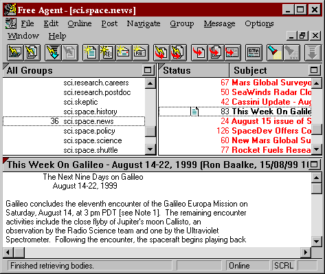 Anche qui, come vedete, le solite tre zone (ma il programma consente di personalizzare al massimo la loro disposizione sullo schermo). La finestra in alto a sinistra porta la dizione 'All groups'. Il triangolino nero in alto sulla barra 'All groups' permette di passare alla visualizzazione dei soli newsgroup ai quali siamo abbonati ('Subscribed groups') o a quella dei soli newsgroup aggiunti recentemente alla lista ('New groups'). La finestra in alto a destra contiene un elenco dei messaggi disponibili nel newsgroup selezionato. La piccola icona con un foglio scritto che compare a lato di alcuni messaggi indica che il loro testo è già stato 'scaricato' sul nostro computer - il che significa che potremo leggerli anche off-line, dopo esserci scollegati da Internet. Durante il collegamento, possiamo in ogni momento richiedere che uno o più messaggi vengano resi disponibili in questo modo: basterà selezionarli, e utilizzare l'opzione 'Get marked article bodies' del menu 'Online'. Fra le altre informazioni fornite vi è la lunghezza in righe del messaggio (si tratta del numero che lo precede) e l'esistenza di eventuali 'catene' di messaggi dedicati alla discussione di uno stesso argomento (indicata da una freccia che contiene il simbolo '+'; in questo caso, il numero fra parentesi quadre che segue indica quanti sono i messaggi che compongono la catena). Infine, la finestra inferiore contiene il testo del messaggio. Quello che abbiamo scelto come esempio è un messaggio proveniente dal newsgroup sci.space.news; si tratta dell'aggiornamento settimanale sulla missione della sonda Galileo, che sta esplorando ormai tempo la zona attorno a Giove e alle sue lune. Naturalmente, la sonda Galileo è solo una delle numerose missioni spaziali seguite dal newsgroup sci.space.news, che a sua volta è solo uno fra le diverse decine di migliaia di newsgroup attivi: un esempio suggestivo della ricchezza di informazioni reperibili attraverso questo strumento di comunicazione in rete! Agent dispone anche di una ricca pulsantiera, che non possiamo qui esaminare dettagliatamente - basta comunque posizionare il puntatore del mouse su un qualunque bottone per ottenere una descrizione sommaria della sua funzione. Agent è capace di tradurre automaticamente immagini, suoni e programmi inviati in formato MIME, e di lanciare a richiesta l'applicazione loro associata. Vediamo di capire meglio cosa questo significhi. Supponiamo di voler spedire, nel newsgroup dedicato ai fan di Woody Allen, una inedita foto di scena relativa alla lavorazione del suo ultimo film, capace sicuramente di fare la felicità di molti altri appassionati. Concettualmente, possiamo pensare a questa operazione come analoga all'affiggere la fotografia su una apposita bacheca pubblica. Ma dal momento che siamo nel mondo dei bit e non in quello degli atomi, la foto andrà prima scannerizzata: trasformata cioè da oggetto fisico a puro contenuto informativo che il computer sia in grado di interpretare. Questa operazione richiede l'aiuto di uno scanner (ve ne sono ormai di assai economici, con prezzi anche inferiori alle duecentomila lire), e produce un normalissimo file, non dissimile da quelli creati, ad esempio, da un programma di videoscrittura. Per 'vedere' l'immagine sullo schermo del nostro computer, basterà disporre di un programma capace di interpretare il file - di riconoscere cioè il particolare formato immagine utilizzato - e di visualizzarlo. Si tratta di programmi assai diffusi, molti dei quali possono essere facilmente reperiti anche in rete. Fin qui, dunque, nessun problema. Ma come inviare l'immagine al newsgroup? Come la posta elettronica, i messaggi inviati ai gruppi Usenet devono di norma limitarsi all'uso dell'ASCII stretto. Non possiamo dunque semplicemente inviare il file con la nostra immagine: prima dobbiamo codificarlo. Agent lo fa per noi, usando appunto la codifica MIME. Ma c'è un problema in più: un'immagine è ricchissima di informazioni (per ogni 'puntino', o 'pixel' dell'immagine, bisogna indicare il colore e la luminosità, e un'immagine dettagliata contiene moltissimi 'puntini'), e il file relativo è spesso di dimensioni piuttosto consistenti. In questi casi, sia per permetterne la ricezione 'a rate', sia per non tagliare fuori gli utenti di sistemi che non accettano la trasmissione o la ricezione di messaggi superiori a una certa lunghezza, è buona norma suddividere il nostro file codificato in più messaggi numerati. Bene: al momento della decodifica, Agent provvederà in maniera automatica o semi automatica a 'raggruppare' questi messaggi, decodificare il file contenuto, e - se gli abbiamo indicato dove trovare il programma adatto - a visualizzarlo sullo schermo (nel caso di un'immagine) o a farlo ascoltare attraverso gli altoparlanti del computer (se si tratta di un file sonoro). Per farlo, basterà selezionare i messaggi interessati, e scegliere dal menu 'File' il comando 'Launch binary attachments'. Le funzionalità di decodifica di questi 'file attachment' è presente, va detto, anche nei moduli news di Netscape e di Outlook. Ma le capacità di Agent in questo campo restano ancora di tutto rispetto, soprattutto per quanto riguarda i file attachment 'spezzettati' in più messaggi. Come è facile capire, un programma di questo tipo trasforma il mondo dei newsgroup Usenet - nato per la trasmissione di messaggi testuali, e dunque apparentemente dalle possibilità multimediali piuttosto limitate - in una vera e propria miniera di multimedialità distribuita. Con tutti i rischi che questo comporta (la maggior parte delle discussioni sulla presenza in rete di immagini pornografiche riguarda proprio i newsgroup, e praticamente non vi è newsgroup - tranne quelli strettamente moderati - in cui non vengano inviati con regolarità messaggi di pubblicità di siti pornografici), ma anche con le immense potenzialità di una distribuzione su scala planetaria, libera e alla portata di tutti, di informazioni non solo te