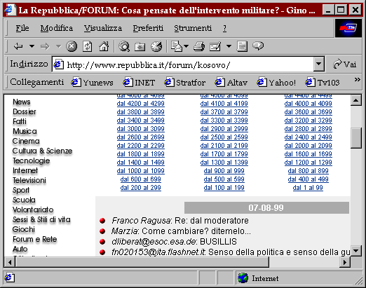Per leggere un messaggio, basta un click sul pallino rosso corrispondente; nel momento in cui leggete un messaggio, vi viene sempre data l'opzione di rispondere all'interno del forum. Quello che abbiamo citato non è che uno delle migliaia di esempi di conferenze su Web. Conferenze diverse possono avere un'apparenza grafica anche molto diversa, possono essere moderate oppure no (in caso affermativo, prima di essere 'affisso' sulla pagina Web della conferenza il messaggio viene letto e approvato dal moderatore), possono essere aperte alla partecipazione di chiunque o solo degli iscritti. Vi sono addirittura siti che permettono a chiunque di creare una propria conferenza sull'argomento preferito (un esempio è Network 54, all'indirizzo http://network54.com/). Fra gli argomenti più diffusi nelle conferenze su Web, oltre all'attualità (moltissimi siti di giornali, riviste, radio e stazioni televisive ospitano forum aperti alla partecipazione del pubblico), vi è l'educazione: le conferenze in rete si sono infatti dimostrate uno strumento validissimo per mantenere in contatto - fra loro e con i docenti - una comunità di studenti, in particolare nel caso di progetti di educazione a distanza (si veda al riguardo il capitolo del libro dedicato a 'Internet per la scuola e la didattica'). Note [16] G. Salza, I nuovi percorsi di Internet, in "Notizie dalle Reti" 1, Roma 1995, p. 15. |