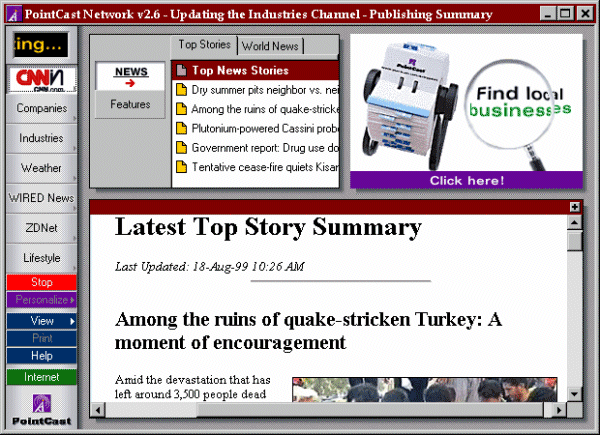 In-box Direct: l'information push di NetscapeNel 1997 Netscape aveva rilasciato uno strumento di information push denominato Netcaster, che si proponeva di competere con gli active channels di casa Microsoft. Netcaster, tuttavia, non sembra aver avuto un particolare successo: un po' perché, come si è già accennato, le tecnologie di information push non hanno avuto quella diffusione immediata e generalizzata che qualcuno si aspettava, un po' perché la 'guerra dei browser' con la Microsoft ha indubbiamente visto Netscape in posizioni sempre più difensive. Le ultime versioni di Netscape non fanno dunque più cenno a Netcaster, e la sola tecnologia di information push messa a disposizione dalla Netscape è basata sull'uso della posta elettronica in HTML, che, ricordiamo, Netscape Messenger è in grado di visualizzare. È così possibile abbonarsi a quelle che sono in sostanza delle buone vecchie liste di distribuzione postale, i cui messaggi arrivano tuttavia in HTML, e possono quindi includere contenuto multimediale. La Netscape ha ribattezzato 'In-box direct' questa tecnologia, e fornisce una lista delle 'pubblicazioni' ricevibili via posta elettronica in formato HTML alla URL http://form.netscape.com/ibd/. La cartella 'Channels' che si trova sulla 'Personal toolbar' di Netscape (in genere visualizzata subito sotto la barra degli indirizzi) si riferisce in realtà a una serie di pagine Internet ospitate sul sito della Netscape (ribattezzato nel 1998 'Netcenter'), e non ha dunque nulla a che fare con l'omonima tecnologia Microsoft. Altri programmi clientSe Netscape sembra avere in un certo senso 'abbandonato il campo' dell'information push, molte altre piccole società si sono affacciate nel settore, con prodotti specifici che sembrano aver individuato le nicchie di utenza più interessate a questa tecnologia. Troviamo così programmi destinati al controllo continuo delle quotazioni di borsa e delle notizie provenienti dai mercati finanziari, o al monitoraggio delle condizioni del tempo. Non mancano, comunque, programmi destinati a seguire un ventaglio più ampio di notizie: si tratta in genere di strumenti altamente personalizzabili, in modo che gli utenti possano seguire solo le novità relative ai settori di loro specifico interesse. Fra i programmi di carattere generale troviamo il già ricordato Entrypoint, che nasce con alle spalle un genitore illustre come la Pointcast. Entrypoint può essere scaricato dal sito http://www.entrypoint.com, o da un qualunque mirror TuCows, e - come molti altri programmi del genere - si presenta come una sottile striscia (ticker) sulla quale scorrono i titoli delle notizie. Un click sul titolo che interessa provoca l'apertura automatica del browser su una pagina Internet che riporta il testo completo della notizia. Il programma può essere personalizzando scegliendo fra una trentina di categorie le tipologie di informazione che interessano maggiormente l'utente. Grazie all'eredità di Pointcast, Entrypoint garantisce un buon numero di fornitori di informazione, fra i quali si segnala in particolare l'agenzia Reuters. Il programma è totalmente gratuito, anche se non è troppo difficile capire che tipo di ritorno economico si aspettino i suoi creatori: il primo fra i pulsanti disponibili, infatti, permette l'installazione automatica del programma Ewallet per la gestione delle carte di credito negli acquisti in rete, e il secondo apre il browser su una lista di negozi consigliati. Fra gli altri programmi di information push, meritano una segnalazione Desktop News, che mette anch'esso a disposizione un notiziario aggiornato periodicamente, sotto forma di una barra scorrevole particolarmente ben studiata (http://www.desktopnews.com), e che ha distribuito nel giugno 1999 l'ultima release della versione 1.1; l'agile My Yahoo! (fermo alla versione 1.8 del gennaio 1998), sviluppato con la collaborazione dell'omonima società che gestisce il popolare indice del Web e particolarmente orientato alle notizie dai mercati finanziari (http://www.netcontrols.com); WorldFlash, giunto alla versione 1.5, aggiornato attraverso le notizie di un vasto numero di agenzie, di riviste e di quotidiani internazionali, che ha l'interessante capacità di includere in tempo reale, fra le informazioni visualizzate sulla propria barra scorrevole, anche le intestazioni dei nuovi messaggi di posta elettronica a noi diretti, controllando automaticamente fino a 8 diversi account (http://www.scroller.com). Una menzione particolare merita poi a nostro avviso News Alert, il minuscolo (pesa solo 53K) programma di information push offerto dalla MSNBC sul proprio sito (http://www.msnbc.com/toolkit.asp). La caratteristica interessante di questo programma - che si basa sul 'feed' di notizie dell'omonima rete televisiva - è l'estrema flessibilità di configurazione: è possibile così impostarlo per ricevere solo le notizie di maggior rilievo (le cosiddette 'breaking news'), e solo nei settori di nostro interesse. Opportunamente configurato, News Alert è assai poco intrusivo: rimane attivo in background, senza disturbare il nostro lavoro al computer, controlla periodicamente le nuove notizie disponibili, e si attiva solo in caso di notizie di estremo rilievo, visualizzando una finestra informativa con un sommario della notizia e il link alla sua trattazione completa sul sito MSNBC. Peccato solo che il concetto di 'breaking news' applicato dalle testate giornalistiche e televisive americane non sempre risponda ai nostri standard, e che il tempismo del 'lancio' sul sito MSNBC sia assai meno soddisfacente di quello di altri siti simili, ad esempio di quello della CNN. Nel settore dell'information push dovrebbe entrare a fine 1999 anche uno dei principali motori di ricerca in rete, Altavista, con un proprio programma denominato MicroPortal: informazioni alla pagina http://www.microav.com. Infine, meritano una segnalazione due programmi di information push per Mac: MacHeadlines (http://www.macaliv
