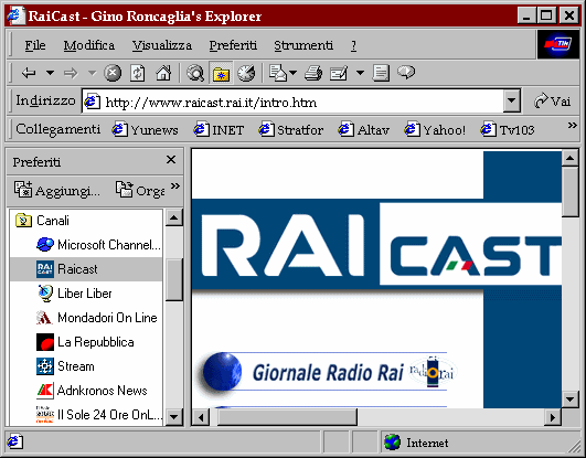L'accesso al canale avviene attraverso Explorer, ma essendo gestito attraverso i controlli ActiveX, un canale non si presenta necessariamente come una normale pagina Web. Chi gestisce il canale può infatti decidere le dimensioni della finestra da aprire, e il tipo di contenuto multimediale da includervi. Basti pensare ai canali forniti dalla RAI attraverso il servizio Raicast: è possibile ad esempio 'abbonarsi' (in maniera naturalmente gratuita) al canale del GR1: in questo caso, una simpatica sigla musicale ci avvertirà del momento della messa in onda del giornale radio (calcolato attraverso l'orologio interno del computer, che deve quindi essere regolato con esattezza); volendo, potremo ascoltarne le notizie come flusso di dati audio in tecnologia Real Audio (ce ne occupiamo a fondo nella sezione di questo libro dedicata allo streaming audio e video). L'utente, che deve disporre dell'apposito plug-in Real Audio e naturalmente di un computer dotato di scheda sonora e casse acustiche, potrà così ascoltare in diretta il giornale radio attraverso il proprio computer. Sempre attraverso i canali Raicast è possibile anche l'accesso automatico alle notizie del televideo, aggiornate in tempo reale e presentate attraverso una piccola finestra dotata di striscia scorrevole. Fra i canali italiani già disponibili, ricordiamo anche quelli di Repubblica e del Sole 24 Ore (che presentano, in forma molto più tradizionale, una pagina con le ultime notizie), Notizia.it (un notiziario on-line che dedica particolare attenzione al mondo della rete), Virgilio, e l'agenzia di notizie ADN Kronos (che permette di ricevere in una sottile finestra da posizionare ovunque sullo schermo le ultime notizie di agenzia).