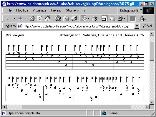 the song the Virgin sang, when she to Bethlem Juda came and... http://zebra.asta.fh-weingarten.de/pub/Sound/ Put your title here ab·so·lute (àb1se-l¡t´, àb´se-l¡t1) adjective Abbr. abs. 1. Perfect in quality or nature; complete. 2. Not mixed; pure. 3. Not limited by restrictions or exceptions;... http://www.sound.net/~mvc/emblem/absolute.html - size 606 bytes - 24 Jan 96 Guitar and Lute Links Classical Guitar and Lute Links. some links and format courtesy of John P. Dimick http://www.teleport.com/~jdimick/ocg.html. Early Music. Astor Piazzolla. Classical MIDI... http://www.mtsu.edu/~yelverto/glynx.html - size 3K - 21 Feb 96 Other Guitar and Lute Music Pages Other Guitar and Lute Music Pages. By starting with these, you can find almost anything on the Internet relating to nylon stringed instruments. I have tried to include... http://world.std.com/~sdrasky/more.html - size 2K - 12 Jan 96 Già questo primo elenco mostra il carattere eterogeneo dell'informazione reperita: se andiamo a consultare le pagine troveremo informazioni (commerciali) su dischi per liuto, consigli (apparentemente non commerciali) di un appassionato sullo stesso argomento, il testo di una canzone per liuto (della quale è disponibile anche lo spartito e una registrazione in formato MIDI), la pagina di un gioco in rete nel quale compare un misterioso liuto che non riusciamo a far suonare, una voce di dizionario relativa alla parola 'absolute', e due pagine di ulteriori rimandi a informazioni relative ai liuti e agli strumenti a corde. Morale: un motore di ricerca di questo tipo ci porta a informazione estremamente eterogenea, e lascia a noi il compito di selezionare quella che ci interessa veramente. In un caso come questo, proseguiremmo probabilmente la navigazione attraverso le ultime due pagine, che sembrano le più promettenti. Dopo qualche salto, arriveremmo fra l'altro: a una antologia di trattati 'classici' sulla posizione delle mani da parte del suonatore di liuto (se avete curiosità, la troverete alla URL http://www.cs.dartmouth.edu/~wbc/hand/Technique.html); a una collezione di una trentina di riproduzioni a colori di quadri nei quali sono raffigurati liuti e suonatori di liuto (alla URL http://www.cs.dartmouth.edu/~wbc/icon/icon.html [33]); a file sonori con registrazioni di sonate per liuto (ad esempio alla URL http://www.cs.dartmouth.edu/~wbc/lute/sound.html); a un documento di suggerimenti e consigli per chi intende acquistare un liuto (alla URL ftp://ftp.cs.dartmouth.edu/pub/lute/Buying_A_Lute.FAQ); a un elenco di liutai e di negozi di liuto sparsi in tutto il mondo (ftp://cs.dartmouth.edu/pub/lute/Luthier.FAQ), alcuni dei quali dotati di propri siti Internet (ad esempio http://www.armandpilon.com/); alle pagine di un negozio che vende attraverso Internet corde per liuto (http://www.daniellarson.com/); all'associazione liutai americani che vende, fra l'altro, libri di istruzioni su come costruirsi da soli un liuto (http://www.cs.dartmouth.edu/~wbc/lsa/lsa.html); alle pagine personali di suonatori di liuto (segnaliamo quella, presente anche in italiano, del liutista romano Federico Marincola: http://www.marincola.com/); a una rivista on-line dedicata esclusivamente alla musica per liuto (http://www.faradic.net/~skorpios/lutebot.htm); al testo integrale (completo di illustrazioni) di un manuale di fine cinquecento che insegna a suonare il liuto (http://members.aol.com/MWhee40252/Barley.html), e così via. Potremo anche scaricare programmi per preparare, stampare e suonare attraverso la scheda sonora o una interfaccia MIDI delle intavolature per liuto (come quello per Windows di Francesco Tribioli denominato Fronimo e disponibile sul server FTP dell'osservatorio di Arcetri o attraverso la URL http://members.aol.com/MWhee40252/Fron.html), o addirittura uno screen-saver basato su immagini di liuti (alla URL http://www.albany.net/~dowland/screen.html). E naturalmente innumerevoli immagini di spartiti e intavolature, come quella qui sotto (presa a mo' di esempio dal lunghissimo elenco disponibile alla URL http://www.cs.dartmouth.edu/~wbc/tab-serv/tab-gif.cgi).