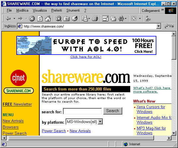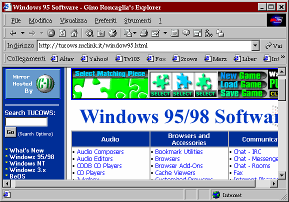 Shareware.com, tra le altre cose, si preoccupa anche di fornirci una stima del tempo necessario per il prelievo, in funzione della velocità del nostro collegamento. È bene specificare che gli archivi di questo sistema si limitano ad indicizzare le collocazioni dei programmi disponibili sui maggiori server FTP per i vari sistemi operativi (come SimTel, Garbo, Cica, Sunsite dell'Università del Minnesota). Per quanto riguarda i programmi specificamente connessi all'utilizzazione di Internet, il sito di riferimento è il più volte ricordato TuCows. All'indirizzo http://www.tucows.com trovate i rimandi a un larghissimo numero di cosiddetti 'mirror' del sito principale: ciascuno contiene il deposito completo dei programmi, e potete scegliere quello che vi sembra più veloce (spesso, ma non necessariamente, si tratterà di un mirror italiano). TuCows contiene programmi per il mondo Windows e, attraverso le reti affiliate Linuxberg e AllMacintosh, per Linux e Mac. Contiene inoltre una ottima raccolta di programmi in Java, utilizzabili su qualsiasi piattaforma che ospiti una macchina virtuale Java (ne parleremo in dettaglio in seguito).