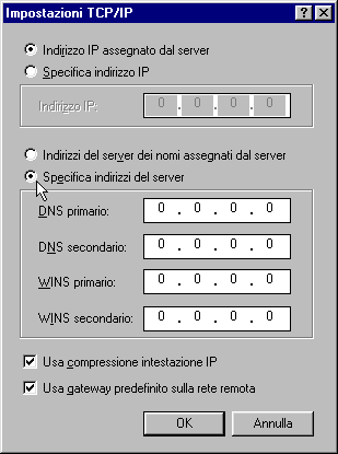 Avendo già avviato un fruttuoso dialogo con il vostro fornitore di connettività non vi mancheranno i dati da inserire durante l'installazione; vi consigliamo, quindi, di proseguire l'installazione scegliendo la seconda delle tre opzioni, così come si vede nella figura 137. Se il provider usa il protocollo PPP, assegna automaticamente IP e DNS, e non è necessario aprire una finestra terminale dopo la connessione (si veda la sezione 'Le domande da fare al provider'), potete rispondere 'No' alla richiesta di modifica delle impostazioni avanzate. In questa fortunata ipotesi, una volta fornite le informazioni relative al vostro indirizzo di posta elettronica, la configurazione dei software di navigazione è conclusa. Altrimenti, sempre con il foglio delle risposte fornite dal provider a portata di mano, selezioniamo 'Modifica le impostazioni avanzate'. Anche in questo caso, però, non sarà difficile realizzare la nostra connessione: è infatti sufficiente seguire le istruzioni rispondendo alle domande e in caso di dubbio lasciare le impostazioni preselezionate da Windows. È inoltre bene ricordare che Windows 98 aggiunge funzionalità a Windows 95 senza mutarne sostanzialmente la struttura: ciò vuol dire che, in caso di problemi, sarà possibile eseguire manualmente la procedura di connessione secondo le istruzioni che abbiamo già dato per Windows 95 [116]. La connessione con Windows NT 4Per configurare NT 4 per l'uso della rete dovremo seguire le seguenti procedure:
