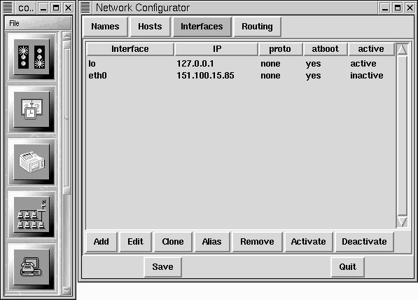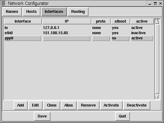 Nel 'Control Panel', il pulsante che avvia il 'Network configurator' è il quarto, quello recante il disegno di una rete (nella figura 142, il penultimo). Come suggerisce il nome, si tratta di un programma che consente di configurare tutte le connessioni di rete su Linux, sia quelle basate su schede di rete vere e proprie (con i relativi parametri), sia le connessioni PPP. Il primo passo da effettuare consiste nella configurazione dei DNS che dovranno essere utilizzati nel collegamento: a tal fine occorre selezionare la scheda 'Names' e digitare l'indirizzo del (o dei) DNS nella casella etichettata 'nameservers'. Questo programma non consente di associare specifici DNS a singole interfacce; pertanto se si utilizzano più connessioni occorre scegliere opportunamente l'ordine in cui i DNS sono elencati (ad esempio se si utilizza sia una connessione di rete diretta sia una connessione PPP remota, e le due connessioni hanno DNS diversi, è opportuno inserire per primo il DNS della connessione diretta). Terminata la configurazione del DNS si potrà passare a quella dell'interfaccia PPP. A questo fine va selezionata la scheda 'Intefaces' (nella figura questa operazione è già stata effettuata) e poi premere il pulsante 'Add'. Il programma farà comparire una finestra Pop-up che ci permette di selezionare il tipo di interfaccia che si desidera aggiungere: selezioneremo l'opzione 'PPP' e poi il pulsante 'OK'. A questo punto compare la maschera di configurazione del PPP.