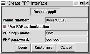 Nella sua versione di base, come potete osservare sulla figura, l'uso di questo strumento è molto semplice: basterà indicare il numero di telefono del proprio provider, selezionare l'autenticazione PAP (ormai adottata da tutti i provider) e indicare 'username' e 'password'. Se occorre raffinare la configurazione, il pulsante 'Customize' permette di accedere ad una maschera di configurazione più complessa, dalla quale è possibile fornire una serie di opzioni avanzate, quali l'avvio del collegamento in fase di boot, le stringhe di inizializzazione del mouse, la selezione della velocità di connessione (i valori suggeriti come default dovrebbero andare ben per quasi tutti i modem), i parametri delle connessione PPP e l'eventuale indirizzo IP statico (qualora se ne disponga). Di norma la configurazione di base è sufficiente a far funzionare il PPP senza problemi.