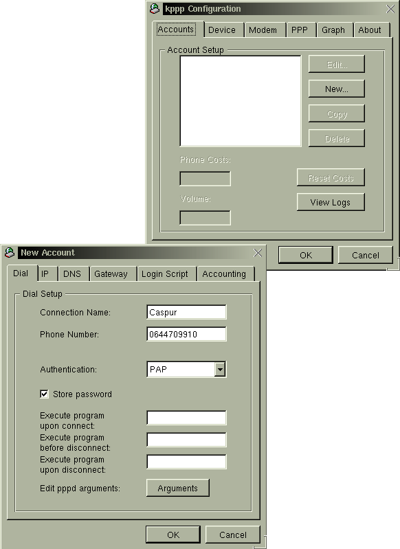 Una volta terminata la configurazione, la nuova connessione PPP viene elencata nella finestra 'Interfaces' del 'Network Configurator', indicata come 'inactive'. Per effettuare il collegamento sarà sufficiente selezionare la riga della connessione PPP che si vuole utilizzare, e premere il pulsante 'Activate': PPPD effettuerà la telefonata e stabilirà la connessione automaticamente. Per chiuderla basterà premere il pulsante 'Deactivate'. Entrambe le operazioni vanno effettuate come utente 'root'. Si noti che è possibile configurare più di una connessione PPP, se si dispone di molteplici account. Un metodo alternativo per configurare e utilizzare PPPD su Linux consiste nel programma Kppp, che fa parte del diffuso desktop environment KDE. La procedura che descriveremo è valida per qualsiasi distribuzione, posto che sia KDE sia Kppp siano stati correttamente installati. In questo caso, per avviare il programma si può usare la voce 'Kppp' che di norma si trova nel gruppo 'Internet' del menu di avvio di KDE, oppure digitare 'kppp' in una finestra di terminale. L'interfaccia di Kppp ricorda quella di 'Accesso remoto' su Windows. Essa permette di configurare (e successivamente di avviare e chiudere) molteplici connessioni PPP. Per effettuare questa operazione bisogna premere il pulsante 'Setup', che dà accesso alla maschera di configurazione, a sua volta suddivisa in varie schede e sottomaschere (a destra nella figura 145).