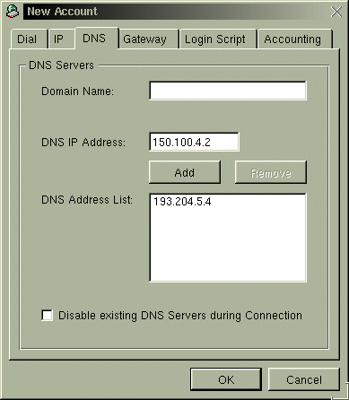 La prima, etichettata 'Accounts', permette di configurare i vari accessi PPP di cui si dispone. Per iniziare la configurazione di un accesso PPP va premuto il pulsante 'New' il quale apre una seconda maschera (a sua volta suddivisa in schede) in cui potranno essere configurati i parametri del singolo account (a sinistra nella figura 145). Nella prima scheda, etichettata 'Dial', vanno indicati il nome della connessione, il numero di telefono del server PPP, il metodo di autenticazione (di norma va indicato il sistema PAP), e se Kppp debba memorizzare nome utente e password di questo account per le sessioni future. La scheda 'IP' permette di indicare se il server assegna un IP dinamico (come avviene di norma) o se si dispone di un IP statico (che va ovviamente specificato). La scheda 'DNS' (nella figura 146) permette di specificare gli indirizzi del o dei DNS validi per quel singolo account; ogni indirizzo va inserito nella casella 'DNS IP Address' e poi aggiunto alla lista con il pulsante 'Add'. È anche possibile fornire un eventuale nome di dominio (che di norma non viene assegnato per una connessione PPP).