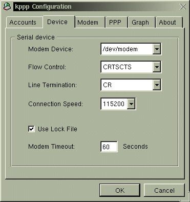 La scheda 'Gateway', infine, contiene le indicazioni del gateway da utilizzare per questo account: di norma va indicato il 'Default gateway'; se si utilizza il computer sia in modalità remota con PPP sia in una rete locale (ad esempio per i portatili) occorre spuntare la casella 'Assign the Default Route to this Gateway'. Terminata la configurazione dell'account premendo il pulsante 'Ok', si può passare a configurare alcuni altri aspetti di Kppp nella maschera principale. Dalla scheda 'Device' (figura 147) si può indicare il tipo di controllo di flusso (CRTSCS è la scelta più opportuna), la velocità di connessione (se dispone di modem V.90 si può indicare il valore di 115200), e il tempo di time-out del modem.