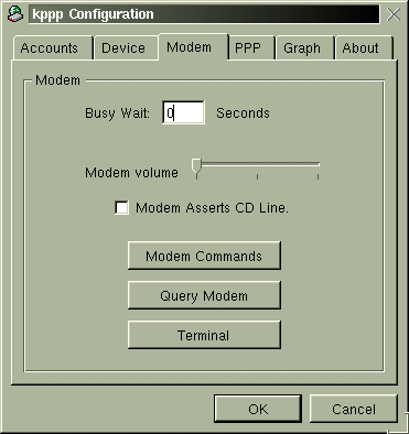 La scheda 'Modem' permette di gestire alcuni parametri di funzionamento del modem. In particolare essa consente di interrogare il modem ('Query modem'), un mezzo molto utile per verificarne il corretto funzionamento, e di specificarne i comandi di gestione ('Modem Commands'). Si noti che tali comandi vanno modificati dai loro valori di default solo se si dispone di un apparecchio che non è completamente compatibile con i comandi Hayes standard.