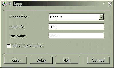 Una volta terminata la configurazione di Kppp, il programma può essere usato per effettuare una connessione. A tale fine occorre avviarlo, selezionare nel menu a cascata 'Connect to' la connessione che si vuole adoperare (come detto è possibile configurare molteplici account PPP), indicare username e password e premere il pulsante 'Connect'.