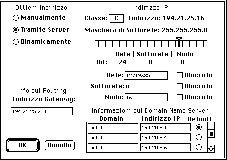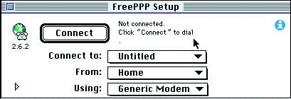 Per attivare una connessione PPP dial-up (ormai la più diffusa fra gli utenti della rete) la configurazione è banale: occorre scegliere 'Tramite Server' nel campo 'Ottieni Indirizzo'; in 'Informazioni sul Domain Name Server' va poi scritto il dominio e il relativo DNS di ogni singolo provider (questi parametri sono indicati dal fornitore di connettività). Con Mac TCP si possono memorizzare DNS per 3 host diversi. Volta per volta si può abilitare il Name Server del provider desiderato selezionando il campo 'Default' corrispondente. In 'Indirizzo Gateway' va specificato l'indirizzo del router [119] fornito dal rivenditore di connettività. Una volta specificata la classe di connettività offerta dal provider nell'area 'Indirizzo IP' (nella maggior parte dei casi va impostata la classe C - in caso di dubbi potete comunque rivolgervi al vostro fornitore di connettività), la configurazione è terminata. A questo punto sarà necessario stabilire la connessione. Per farlo, potrà essere usato un software semplice da installare e facile da usare: FreePPP [120], disponibile nel CDROM allegato (programma su CD). Per installare FreePPP sarà sufficiente fare un doppio click sull'Installer del programma e seguire le istruzioni [121]. Anche la configurazione di questo software è semplice, vediamola insieme. Come prima cosa attiviamo, nella cartella FreePPP che troveremo dopo l'installazione nell'Hard Disk del nostro Mac, il file FreePPP Setup.