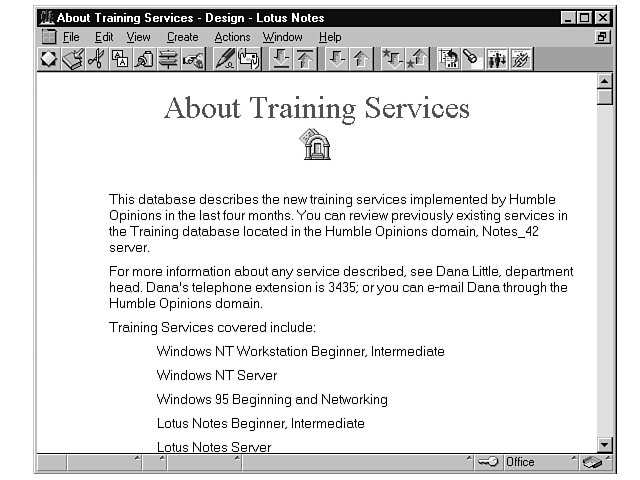 When you create your own database in Lesson 16, youll also create an About document. Figure 11.1 shows the About document for a database about new training services that was created for the Humble Opinions company.