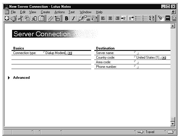 Another setting you must complete includes the connection to the server. Youll need to know the exact name of the server, as well as the phone number you need to connect to the modem on the server. You can get both from your Notes Administrator. Follow these steps to create the server connection.