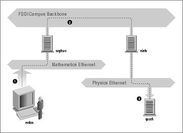 This connection is handled by a dedicated host called a gateway that handles incoming and outgoing packets by copying them between the two Ethernets and the FDDI fiber optic cable. For example, if you are at the Math department and want to access quark on the Physics department's LAN from your Linux box, the networking software will not send packets to quark directly because it is not on the same Ethernet. Therefore, it has to rely on the gateway to act as a forwarder. The gateway (named sophus) then forwards these packets to its peer gateway niels at the Physics department, using the backbone network, with niels delivering it to the destination machine. Data flow between erdos and quark is shown in Figure 1-1.