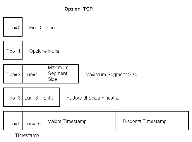 Vi sono varie opzioni ammissibili, di cui la piu' importante e' l'indicazione della dimensione massima di segmento (Maximum Segment Size - MSS). Questa opzione viene normalmente scambiata nel primo segmento di una connessione.