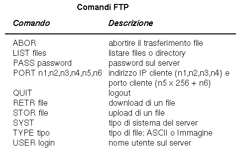 Il protocollo FTP e' lo standard Internet per i file transfer. FTP copia un file completo tra due sistemi. Per usare FTP il client deve compiere un login alla stazione server, con un nome e password validi, oppure puo' essere configurato il server per accettare login anonimo, usando il nome convenzionale di login anonymous o ftp.