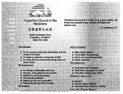 Il punto è questo: il mese scorso ero al lavoro sulla pagina Web della mia chiesa. La nostra chiesa ha appena avviato una congregazione cinese e dunque ha adesso due nomi, uno dei quali rappresentabile in ASCII, l'altro no. La pagina si presenta così: