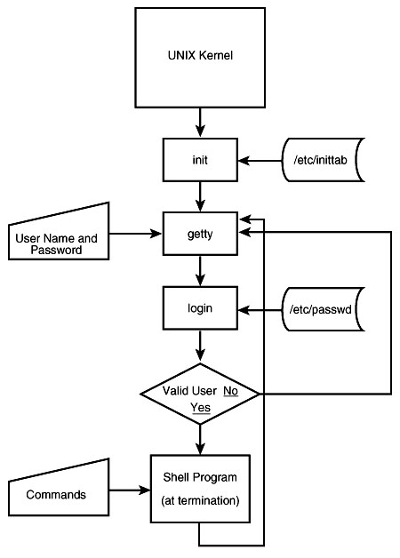 How the Kernel and the Shell InteractWhen a UNIX system is brought online, the program unix (the Kernel) is loaded into the computer's main memory, where it remains until the computer is shut down. During the bootup process, the program init runs as a background task and remains running until shutdown. This program scans the file /etc/inittab, which lists what ports have terminals and their characteristics. When an active, open terminal is found, init calls the program getty, which issues a login: prompt to the terminal's monitor. With these processes in place and running, the user is ready to start interacting with the system. UNIX Calls the Shell at LoginFigure 8.1 shows the process flow from the kernel through the login process. At this point the user is in an active shell, ready to give command to the system. Figure 8.1. During login, when you type your user name, getty issues a password: prompt to the monitor. After you type your password, getty calls login, which scans for a matching entry in the file /etc/passwd. If a match is made, login proceeds to take you to your home directory and then passes control to a session startup program; both the user name and password are specified by the entry in /etc/passwd. Although this might be a specific application program, such as a menu program, normally the session startup program is a shell program such as /bin/sh, the Bourne shell. From here, the shell program reads the files /etc/profile and .profile, which set up the system-wide and user-specific environment criteria. At this point, the shell issues a command prompt such as $. When the shell is terminated, the kernel returns control to the init program, which restarts the login process. Termination can happen in one of two ways: with the exit command or when the kernel issues a kill command to the shell process. At termination, the kernel recovers all resources used by the user and the shell program. The Shell and Child ProcessesIn the Unix system, there are many layers of programs starting from the kernel through a given application program or command. The relationship of these layers is represented in Figure 8.2. Figure 8.2. After you finish logging on, the shell program layer is in direct contact with the kernel, as shown in Figure 8.2. As you type a command such as $ ls, the shell locates the actual program file, /bin/ls, and passes it to the kernel to execute. The kernel creates a new child process area, loads the program, and executes the instructions in /bin/ls. After program completion, the kernel recovers the process area and returns control to the parent shell program. To see an example of this, type the following command: $ps This lists the processes you are currently running. You will see the shell program and the ps program. Now type the following: $sleep 10 & $ps The first command creates a sleep child process to run in background, which you see listed with the ps command. Whenever you enter a command, a child process is created and independently executes from the parent process or shell. This leaves the parent intact to continue other work. Auto-Execution of the ShellSome UNIX resources, such as cron, can execute a shell program without human interaction. When using this feature, the user needs to specify which shell to run in the first line of the shell program, like this: #! /bin/sh This specifies the Bourne shell. You should also redirect any output, because no terminal is associated with auto-execution. This is described in the "File Handling: Input/Output Redirection and Pipes" section later in this chapter. The Functions and Features of a ShellIt doesn't matter which of the standard shells you choose, because they all have the same purpose: to provide a user interface to UNIX. To provide this interface, all the shells offer the same basic characteristics: