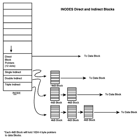 The layout of the cylinder group is: Boot block Primary superblock Redundant superblock Cylinder group information Inode table Data blocks The boot block and the primary superblock will only be there if this is the first cylinder group; otherwise, it may be filled with data. Inodes are fixed-length entries that vary in their length according to the OS implemented. SVR4 implementation is 128 bytes for a UFS inode and 64 bytes for an S5 inode. The inode maintains all of the pertinent information about the file except for the filename and the data. The information maintained by the inode is as follows: File permissions or mode Type of file Number of hard links Current owner Group associated to the file Actual file size in bytes Time Stamps Time/Date file last changed Time/Date file last accessed Time/Date last inode modification Single indirect block pointer Double indirect block pointer Triple indirect block pointer There are 15 slots in the inode structure for disk address or pointers(see Figure 19.6). Twelve of the slots are for direct block addressing. A direct address can either point to a complete block or to a fragment of that block. The block and fragment sizes we are discussing are configurable parameters that are set at filesystem creation. They cannot be altered unless the filesystem is removed and re-created with the new parameters. Figure 19.6. Listing of a typical AIX Root directory using ls -ali, to indicate the inode numbers for each file entry in the directory.