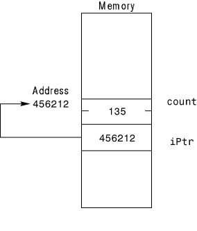 The following code defines an integer variable named count. The value 135 is stored in count as count is defined. Immediately after that integer is defined, a pointer to an integer variable named iPtr is defined. The third line then stores the address