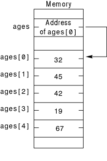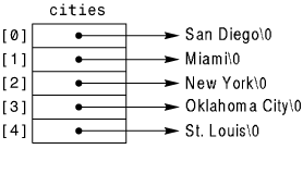 Figure 16.6 shows what the cities array looks like in memory. Each element, cities[0] through cities[4], holds an address to a city name. You can print each of the names using the %s format code.