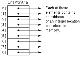 Figure 16.5 shows an array of nine integer pointers. The array is named intPtrAra, and each element in the array is a pointer to an integer somewhere else in memory. The arrows indicate that each element holds an address of another value somewhere.