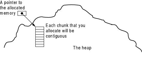 Figure 18.2 shows you what Visual C++ does when you request eight bytes from the heap. Visual C++ goes to the heap and finds where it wants to grab those eight bytes. When Visual C++ gets the eight bytes, however, those bytes are always together, with