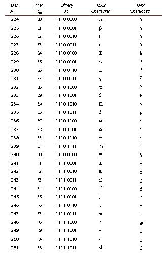 This appendix cross-references the characters represented by ASCII and ANSI code. To convert a code into a character, use Chr(code); to convert a character into a code, use Asc(char). ANSI codes lower than 20 should not be used in a Web