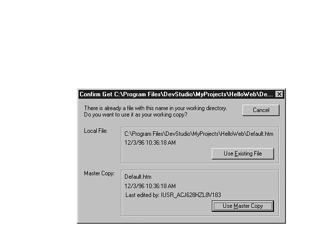 You can open a file with its native editor by double-clicking on the file. You also can select the file and right-click the mouse to display the shortcut menu. Then, you can select the Open menu option to open the file with its default editor. You also can choose the Open With menu option to open the file with another application, as long as the selected program supports the file type. When you open a file in your project, the client first attempts to get the file from the working directory on the client machine. If no working copy exists, the client machine requests a working copy from the server. The server machine sends a copy of the master file to the client and places the file in the working directory of the client machine. Visual InterDev provides visual cues to indicate the status of the file. The icon for a file that has a working copy resident on the client machine is colored, and the icon for a file type that doesn't have a working copy resident on the client machine or that is read-only is grayed. You can request a working copy from the server by selecting the file and choosing the Get Working Copy option from the shortcut menu. This command retrieves the file from the server. If you have already retrieved a working copy and made changes to the file, a warning message is displayed, indicating that you already have a working copy of the file. The message asks whether you want to use the local file or the copy from the server as your working copy. The dialog window displays the file statistics for both the server master copy and the local file, including the name, date, and time of each. You then can choose to use the existing local file, use the master copy from the server, or cancel the action. Figure 4.1 displays the Confirm Get dialog window for a sample project file that already has a local file on the client machine. The Confirm Get dialog window. After you have made changes to a file, you choose the Save, Save As, or Save All option to save your changes. This action updates the master copy on the server. The Save command saves the current file, while the Save As command enables you to save the file with another name. The Save All option saves all the files in your project. Visual InterDev won't inherently resolve conflicts between changes and updates to files. When you get a working copy of a file from the server, you don't place a lock on this file to keep others from retrieving and making changes to the file. Also, the server won't warn you that someone has checked out this file. For big development teams, you should use a source code control package. Visual InterDev is fully compatible with Microsoft Visual SourceSafe and can be integrated to provide a robust option for managing your project source code. By using this combination, you can ensure that developers can exclusively check out files from the server. When the updates are made, a developer can send the file back to the server for others to access. On Day 19, "Working Effectively in Teams with Visual SourceSafe," you will learn how to use and integrate Visual SourceSafe with your Visual InterDev projects. Visual InterDev uses a client-server model for development that's very effective. This model is similar to the interaction of a production web site. Your information is downloaded to the client upon request. You interact with the information, and the changes are sent back to the server. Dissecting the Components of a Visual InterDev ProjectA Visual InterDev can contain many individual files and components. In this section, you will be guided through this maze and introduced to the most common and relevant files that you will be working with. Web Project FilesThese files are the main ingredients of which your web site is comprised. The most typical files in this category include the following: