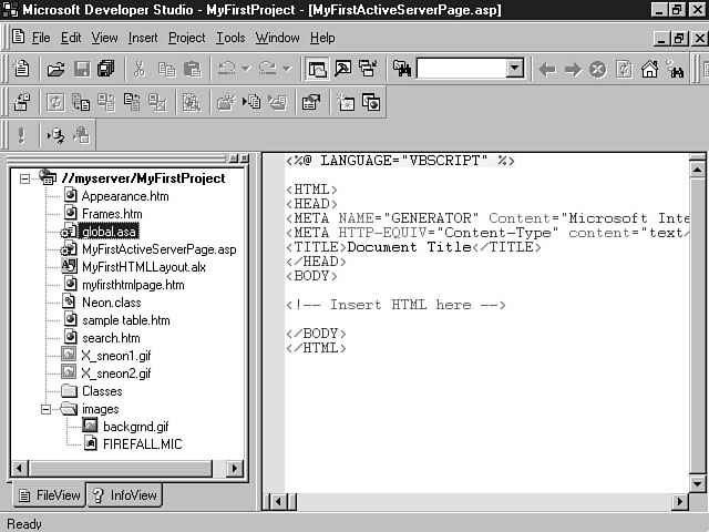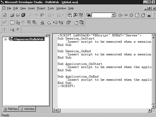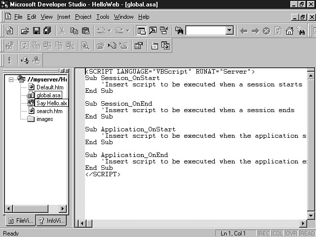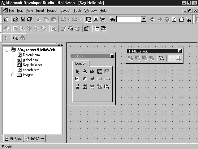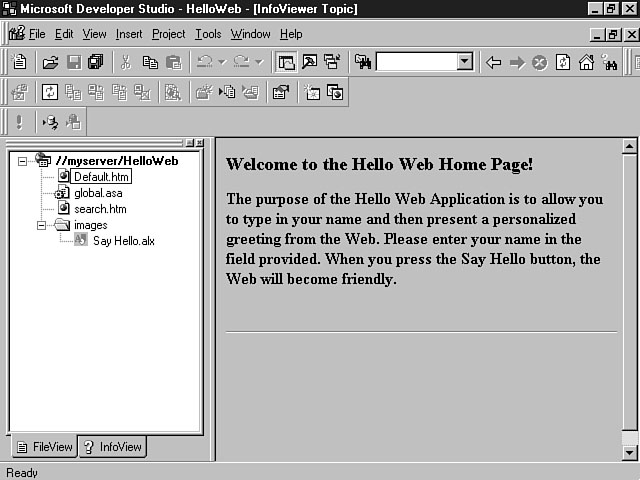 Day 4Creating Your First Visual InterDev ProjectToday is going to be an exciting day. You finally get to create your first project using Visual InterDev. You have learned about many features in the last few days, and in this lesson, you will finally have a chance to experience some of these features for the first time. You will get the most out of this lesson if you practice using the tools as you go along. To begin the day, you will explore a standard Visual InterDev project, and take a look at its dissected components. This dissection won't be as dreadful as your experience with a frog was in high school biology, though. In this section, you will learn the different components and parts of a project. This knowledge should build a foundation so that you can appropriately use all of the Visual InterDev features and technologies in developing your Web-based applications. After looking at each of the Visual InterDev project components, you will get a brief refresher on browser extensions and how they fit into the Visual InterDev scheme. At the end of today's lesson, you will build your first Hello Web application. For C programmers, this application will be a little more sophisticated than the simple Hello World application that you built for your first C program. The Hello Web application will contain most of the main project components that are the focus of this lesson. While you won't be developing the whole application, you will be adding some code and interacting with the components and code provided for you. This lesson should be a very good introduction to the Visual InterDev development experience. Get a refill on that cup of coffee, and let's begin. Exploring a Standard ProjectAt this point, you have read a lot about the features of Visual InterDev as well as the various technologies that it supports. The focus of this lesson is on assimilating what you've read into a Visual InterDev project. If you have participated in any type of development effort, you are familiar with the concept of a project. You know that a project usually consists of various files that come together to build an application. Developing an application is like making pancakes. When you're making pancakes, you have to add specific ingredients that include the pancake mix, eggs, oil, and milk, into a bowl. The ingredients symbolize the technologies such as HTML, ActiveX, and VBScript. The bowl symbolizes the project that provides a workspace for you to work with the ingredients. Once you have mixed the ingredients in a bowl, you cook the results to produce the finished product. Likewise, once you have finished cooking up your Web pages with Visual InterDev, you will deploy them for display on your Web server. Understanding a Visual InterDev ProjectA Visual InterDev project consists of multiple files that integrate to form your web site and Web-based application. During development, you can install both the client and server portions on the same machine. Yesterday, you learned about the advantages and disadvantages of this approach. A more typical configuration enables the Visual InterDev development environment on the client machine to access all of the files on a central web server. These files are downloaded from the server to your machine in a local working directory so you can make any changes to your code. Possible project files include HTML files, Active Server Pages, images, and other components that make up your web site. When you create a new Visual InterDev project, Visual InterDev builds a sub-directory for your web within the root directory of your web server. Your project files will be stored within this sub-directory. The name of this sub-directory assumes the name of your project. For example, if you named your project MyFirstProject, a folder would be created within the root directory of your Web server called MyFirstProject. You also can create sub-directory folders from within Visual InterDev to organize your files within your project directory. An example would be the Images sub-directory that's created by default when you create a Visual InterDev project. This directory structure contains all of the master copies of your files. A virtual root directory for your Web site also is created on your web server. This virtual root directory takes on the name of your project and points to the files within your project sub-directory. The virtual root represents the directory that contains all of the files for a project on your Web server. The virtual root is comprised of the Web server name and the virtual root directory for your project. The Web server name also is referred to as the domain name. The following example shows a virtual root for a sample project. Http://MyServer/MyFirstProject In this example, you see how the name of the Web server, MyServer, and the name of a project, MyFirstProject, join together to form a virtual root for your application. You can see the virtual root for your application from within Visual InterDev, using FileView. Visual InterDev saves you time by handling the creation of this virtual directory structure. The advantage of the virtual root is that users can access your files through a Uniform Resource Locator (URL) instead of having to search through your project file directory structure. Taking this example a step further, a sample URL for your project might consist of the following: Http://MyServer/MyFirstProject/Default.htm where Default.htm is the name of a web page in your project. By default, a global file (global.asa) and a search file (search.htm) are created. These files are placed in the root of your web project directory. The global file enables you to place server-side script for initialization and termination routines for your session and application. The search file adds full text searching capabilities to your web pages. Visual InterDev also creates a local working directory on your client machine. This working directory serves as a placeholder for th
