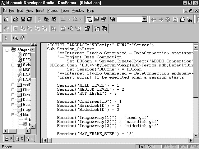 HTML FilesHTML files contain your HTML code and are denoted with the .htm extension. These files also might contain objects such as ActiveX controls, Java applets, Netscape plug-ins, ActiveX Layout files, and images and multimedia files. You can activate the appropriate editor for most of these objects by placing the cursor over the file reference in the HTML code and right-clicking on the mouse. This action displays a shortcut menu containing a menu item for editing the object. You can select the menu option, and the object will be opened in its native editor. For example, right-clicking the mouse while your cursor is on an ActiveX control reference in your HTML file opens the Object Editor. Your cursor must be placed between the <OBJECT> tags for that control. On Day 2, "Visual InterDev: Up Close and Personal," you received a brief overview of the HTML editors that are provided with Visual InterDev. You have two main choices to create and edit your basic HTML code: the HTML Source Editor and the FrontPage Editor for Visual InterDev. The HTML Source Editor provides a specialized text editor that enables you to create and maintain your HTML code. This editor provides some specialized features over basic text editors in that the HTML Source Editor displays your HTML code in a color-coded fashion. This format enables you to distinguish the different types of text within the file. For example, HTML code is a different color than your comments within the code. The FrontPage Editor enables you to visually create your HTML web page. You select objects and choose properties for your web page, and this WYSIWYG editor generates the HTML for you. You still can access and manipulate the generated HTML. You also can add your own custom HTML. If you're stubborn and want to stick with Notepad or some other editor, Visual InterDev also enables you to use other editors to create HTML code. You then can import this code into your Visual InterDev project. You also can create client-side script to be included in your HTML files. This script will be downloaded from the server with the web page and will be executed on the client machine. An example of client-side script would be providing basic field validation for a form. You can create client-side script by using the available HTML editors within Visual InterDev or another editor. The script code is denoted by the <% %> delimiters and is located between the <SCRIPT> and </SCRIPT> tags. Visual InterDev supports Microsoft's VBScript as the default scripting language, and you also can use Microsoft's implementation of JavaScript called JScript from within a Visual InterDev project. Global FileThis file is automatically generated when you create a new project and is denoted by the .asa file extension. The global.asa file enables you to use server-side script for initializing your application at start-up, handling your database connections, and cleaning up the application when the application is finished. You can add scripting code for the duration of both the application and the user sessions. A user session enables you to maintain state with the client machine. An example of using the session events would be maintaining a database connection with the client machine. This persistent state can be very useful for tasks such as high-volume sales order entry applications where you need to make sure that the order is confirmed. Figure 4.2 shows an example of the global.asa file that is created by Visual InterDev when you begin a new project. The global.asa file as viewed through the HTML Source Editor. Figure 4.2 shows how Visual InterDev creates a shell for your scripting code. The scripting code is indicated at the top of the file. This example uses VBScript as its default scripting language. The RUNAT=Server command instructs Visual InterDev to execute this script at the server. Comments are included to show you where to put your application and session code. Notice the four sub-procedures that are created for your application within this file: Session_OnStart, Session_OnEnd, Application_OnStart, and Application_OnEnd. The Application_OnStart event is initiated when the application is first accessed. Specifically, this code is executed when the first page of the application is requested. You use this event to make information available to all users of your applications. For example, if you wanted to set a variable or display a message for all client machines that requested your application, you would populate the variable or define the message in this event. Then, as users accessed your application, the variable and message would be available to them. This information also is available to any of your web pages. You can use this event to reduce redundancy in your code. The Application_OnEnd event executes when the web server is stopped. You should include termination and clean-up routines for ensuring that the application finishes cleanly and smoothly. Also, you might want to add checks for any unsaved data. The Session_OnStart event is activated when the user requests a first page. When you add database connection to your application, the scripting code for that connection is placed in the Session_OnStart event. Each session is unique to a user and absorbs some server overhead. Use this event wisely, and resist the temptation to place too many objects in this event. Additional users can present a resource nightmare and burden. You can create objects at the page level to avoid the resource issue. A good use of the session event involves the use of Recordset variables to store database values across your web pages. In this way, you can avoid having to maintain access to those values across related web pages. The Session_OnEnd event executes when the user session is over. A session can end in several ways. First, the session terminates if the user doesn't request a page within the time period specified by the Timeout property of the Session object. The default valu