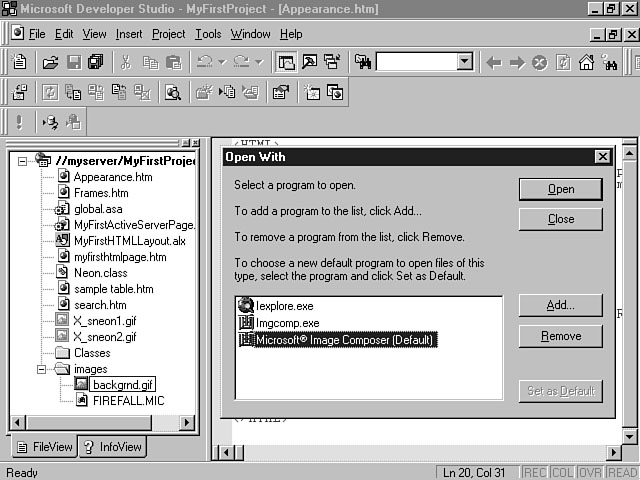 Image and Multimedia FilesVisual InterDev includes several additional applications that enable you to create and manage image and multimedia files. These files can be easily incorporated into your project to enhance the user experience. Microsoft Image Composer, Music Producer, and Media Manager are very robust products and are discussed in detail toward the end of this week on Day 6, "Spicing Up Your Interface with Images and Multimedia." You also can use other products to create your images and multimedia files. Visual InterDev supports practically all of the standard Internet file formats for these objects. You can work with these files by double-clicking on the particular file. This action causes the file to be opened with its native application if there's a default application associated with the file type. If no default application has been linked with this file, you need to use the Open With dialog window to associate an application from the listbox with this file. From this window, you can select a program from the list and press the Default push button to make this application the default editor for this file. You also can add applications as well as remove them from the list. Figure 4.4 displays the Open With dialog window for a .gif image that has been selected. You also can use the Open With dialog window to open files with a different application than the program that has been associated with that file. Both editors must support the specified file type. For example, you can use Image Composer to open a .gif file that had been created with another graphics application. The Open With dialog window. You also can open these files by selecting the file and right-clicking the mouse. The shortcut menu is displayed, and you can select either the Open or Open With menu option.